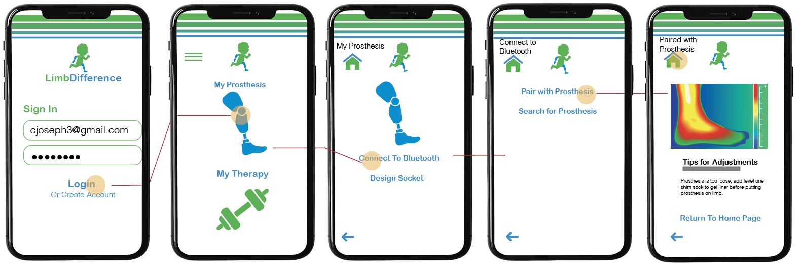Once the user signs in, two options are available. Selecting “My Prosthesis” prompts the user to either connect via Bluetooth or design a custom socket. When connected through Bluetooth, the system reads the patient’s pressure points and displays personalized tips to enhance comfort.