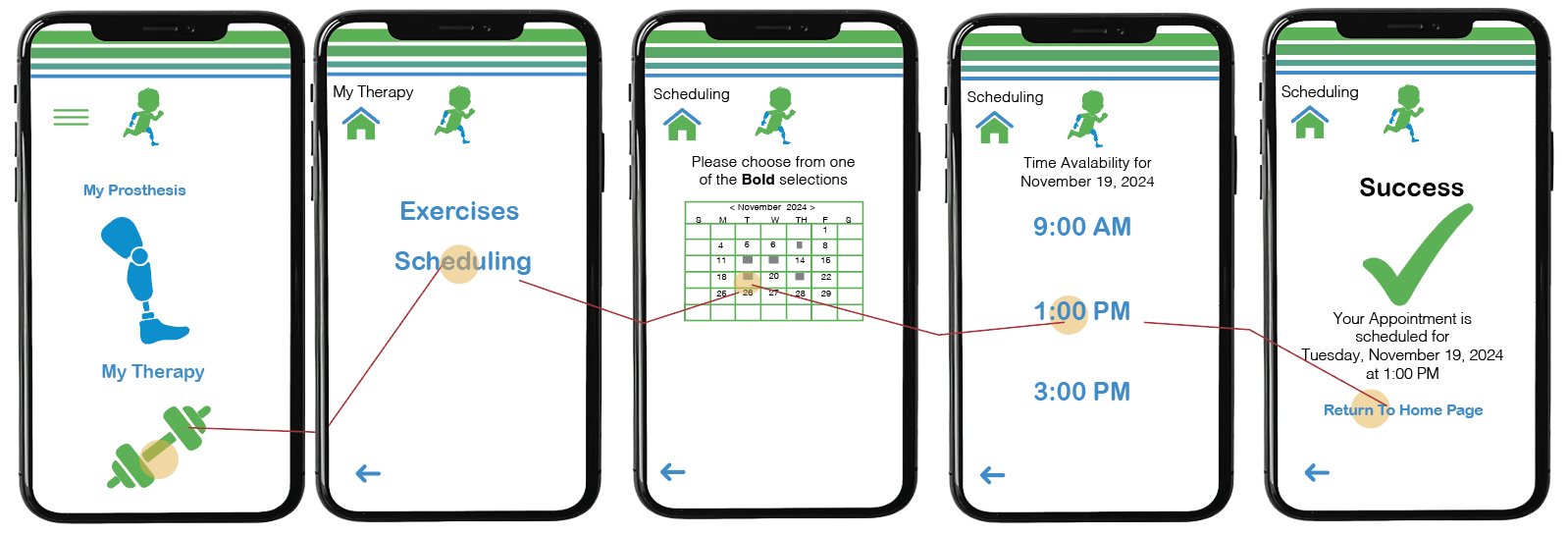 To schedule a therapy appointment, users select “Therapy” then “Scheduling,” choose an available date from the calendar, pick a time slot, and receive a confirmation once the appointment is scheduled.