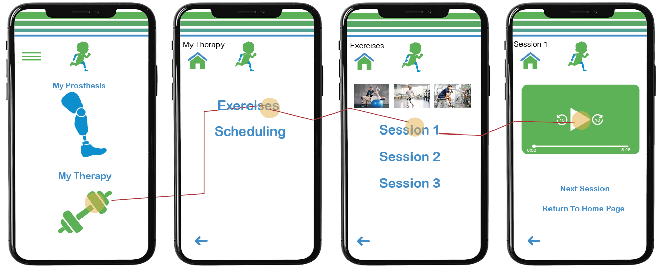 To access therapy exercises, the user will navigate to “My Therapy,” select “Exercises,” and then choose the session that best suits their needs. From there, they can view a guided video demonstration explaining how to properly perform the selected exercise.